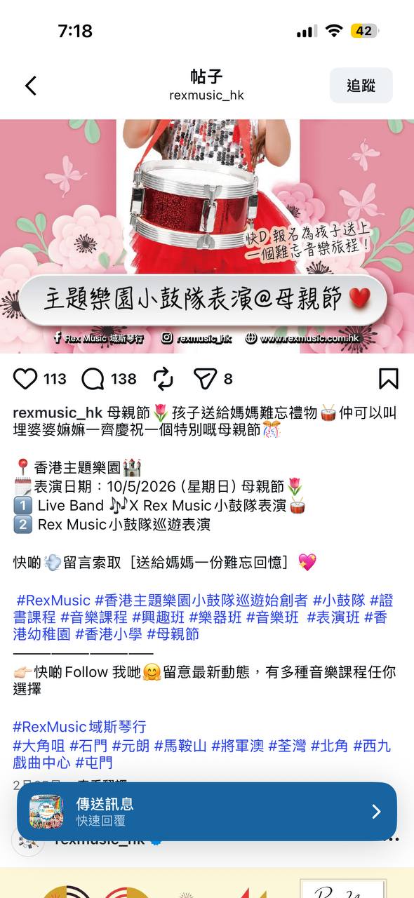 主題樂園小鼓隊表演@母親節母親節,孩子送給媽媽難忘禮物,仲可以叫埋婆婆嫲嫲一齊慶祝一個特別嘅母親節。活動包括 Live Band 🎵 X Rex Music 小鼓隊表演及 Rex Music 小鼓隊巡遊表演。Status: active日期: 2026-05-10 - 2026-05-10活動模式: 線上活動全日活動: Yes立即參加