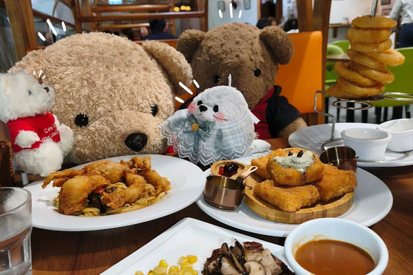 熊熊陪食: 店內裝潢以木系為主調,最特別的是每張餐桌都會坐著一隻不同造型的__迷你啤啤熊__陪你用餐。門口更有巨型熊公仔供客人拍照打卡。
