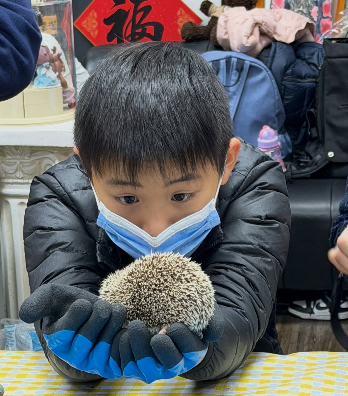 對於比較「有個性」的朋友,例如刺蝟 Ruby 仔,我們會讓小朋友戴上專用手套,像「小科學家」一樣觀察牠如何因怕醜而縮成刺波波。這種「安全而神祕」的接觸,讓孩子學會了尊重每一種生物獨特的性格與界線。